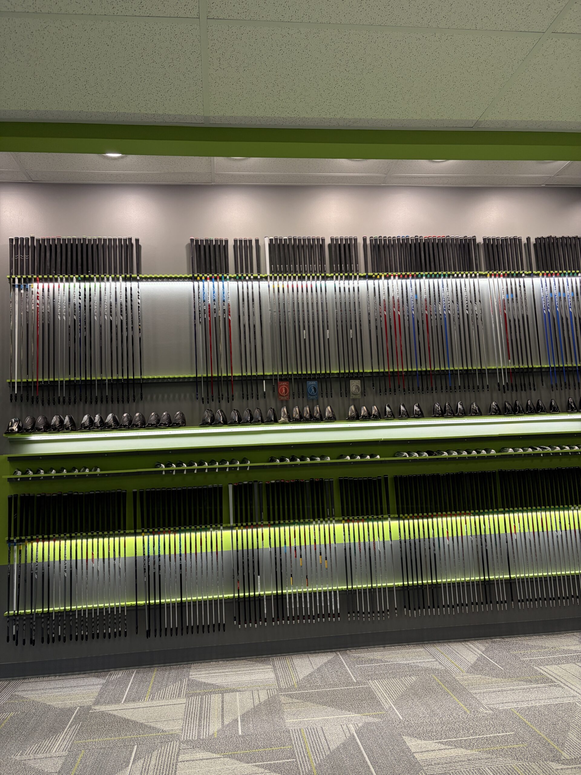 Today, club fitting is often limited to manufacturer-run “demo days,” where the course receives only a modest commission from a single-day event. Historically, the barrier to offering a comprehensive in-house fitting program has been the cost of acquiring the full range of shafts and interchangeable clubheads from leading manufacturers such as Callaway, Ping, TaylorMade, and Titleist as illustrated here:
