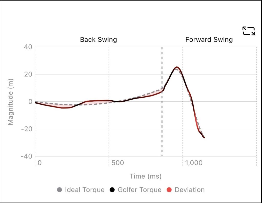 The software displays one’s actual swing path to their ideal swing path that is impressive as illustrated here: